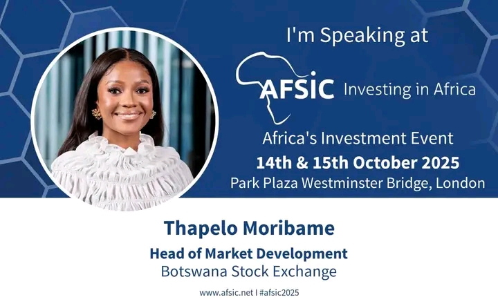 Thapelo Moribame to Represent Botswana at AFSIC 2025 as a Leading Voice in African Capital MMarkets. Thapelo Moribame, the Head of Market Development at the Botswana Stock Exchange (BSE), is set to feature among Africa’s leading financial voices at the 2025 AFSIC – Investing in Africa conference. Recognized for her transformative leadership and deep expertise in capital markets, Moribame has built an impressive career spanning over 18 years in financial market development, SME financing, business growth, and policy reform.
